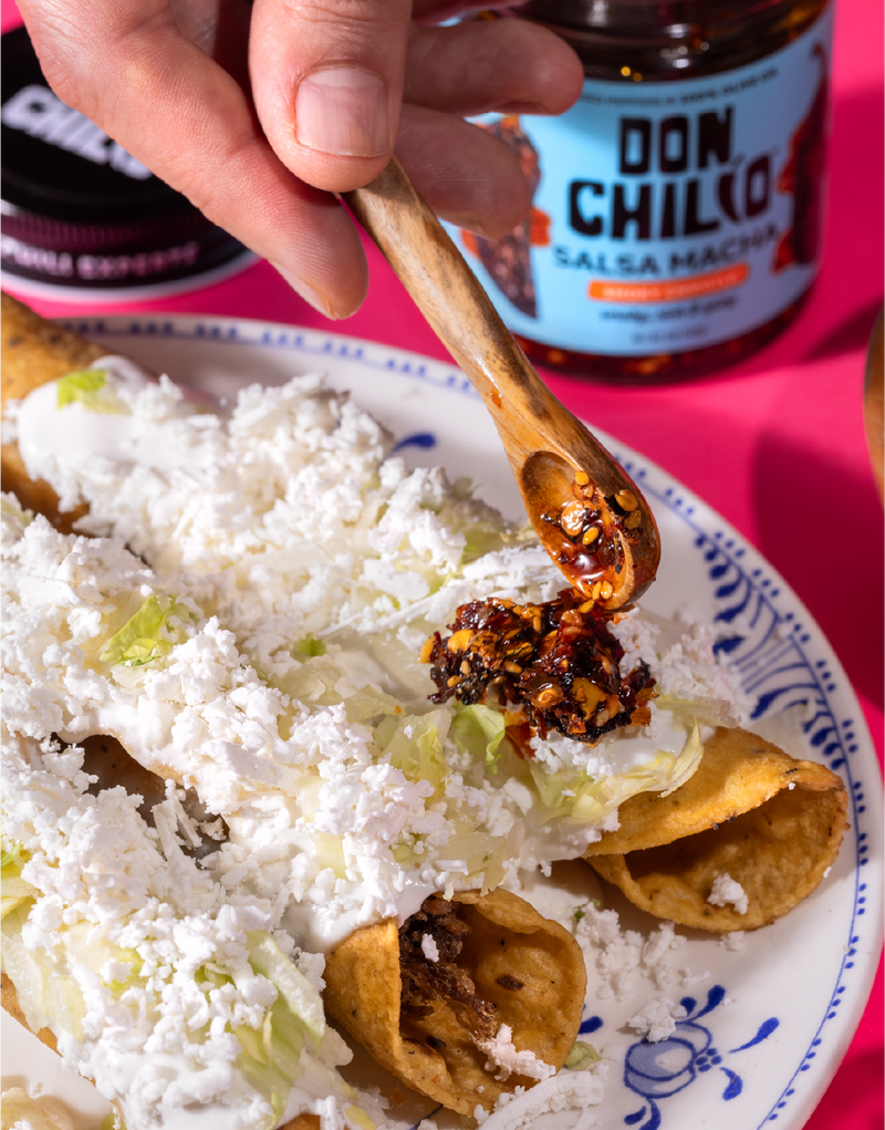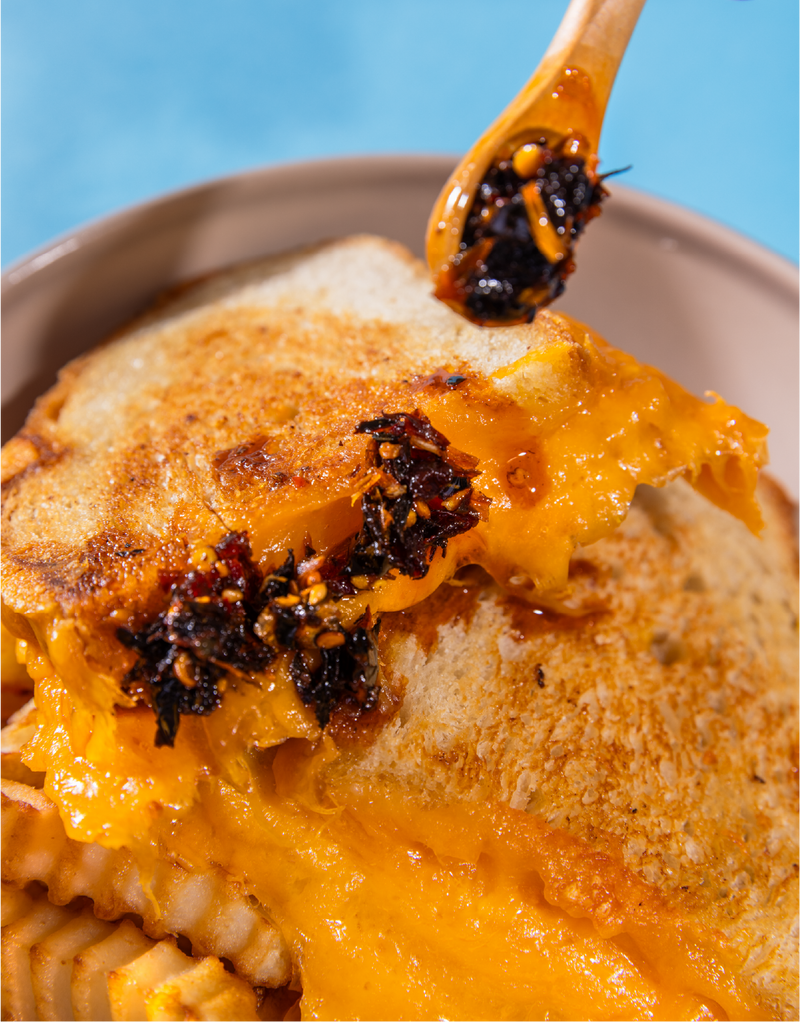 A smoky, crunchy chili oil made with dried peppers, nuts, and seeds in olive oil. Richer than chili crisp. Deeper flavor. Once you try it, you'll understand.